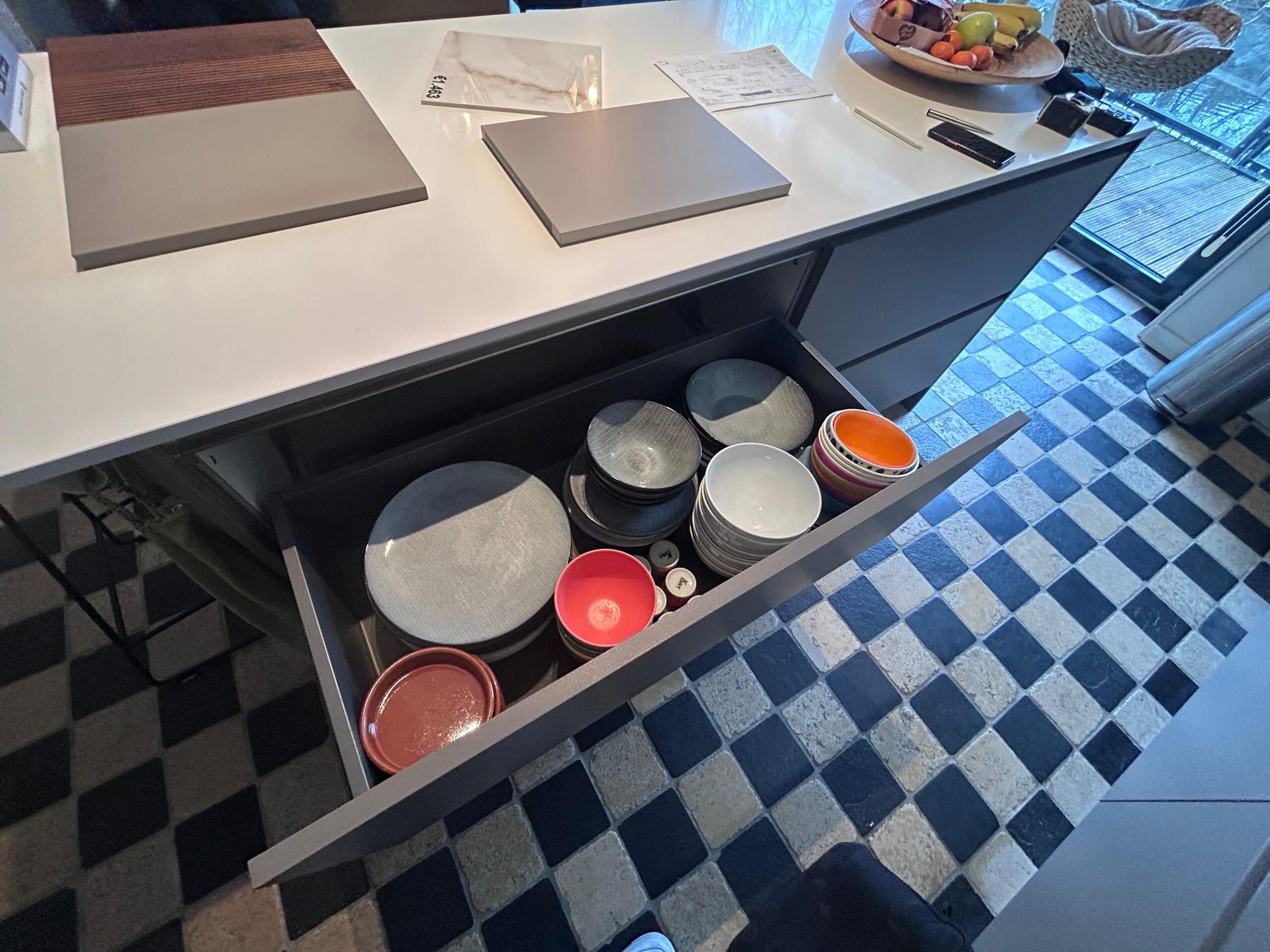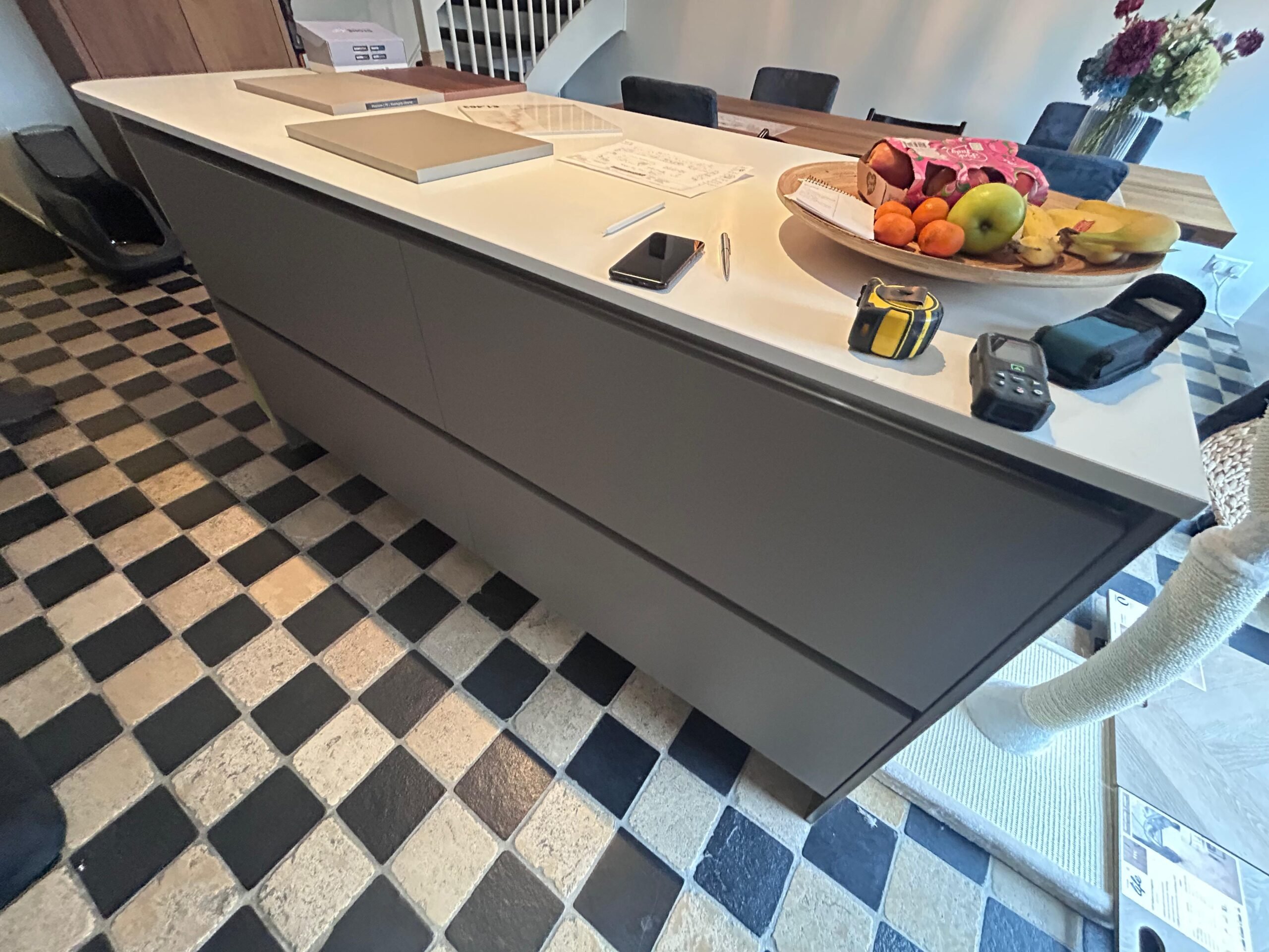 Prachtige luxe Duitse Häcker keuken in stijlvolle grijze uitvoering. Deze moderne keuken met kookeiland en baropstelling is een echte blikvanger en combineert design met optimaal gebruiksgemak.
