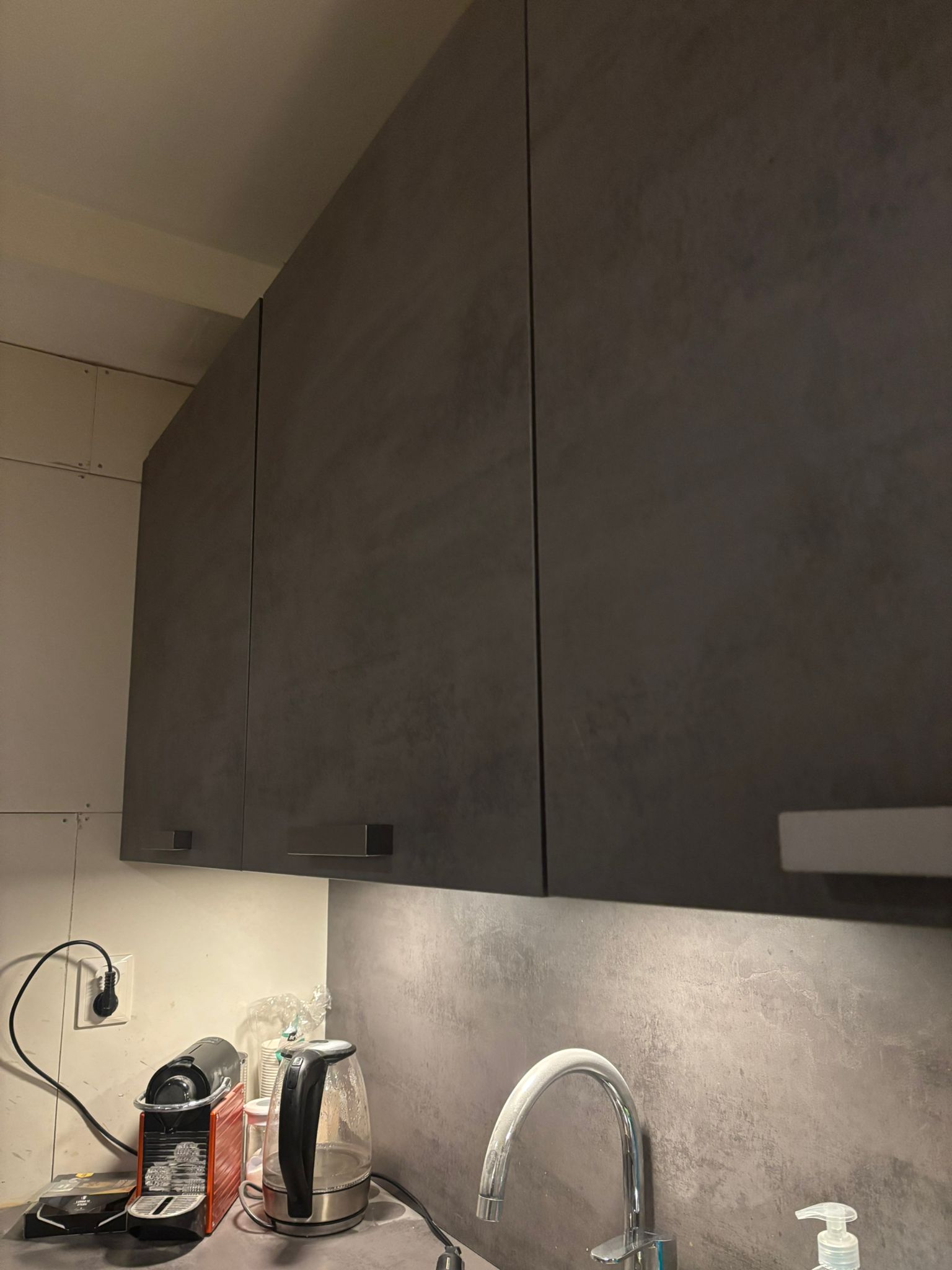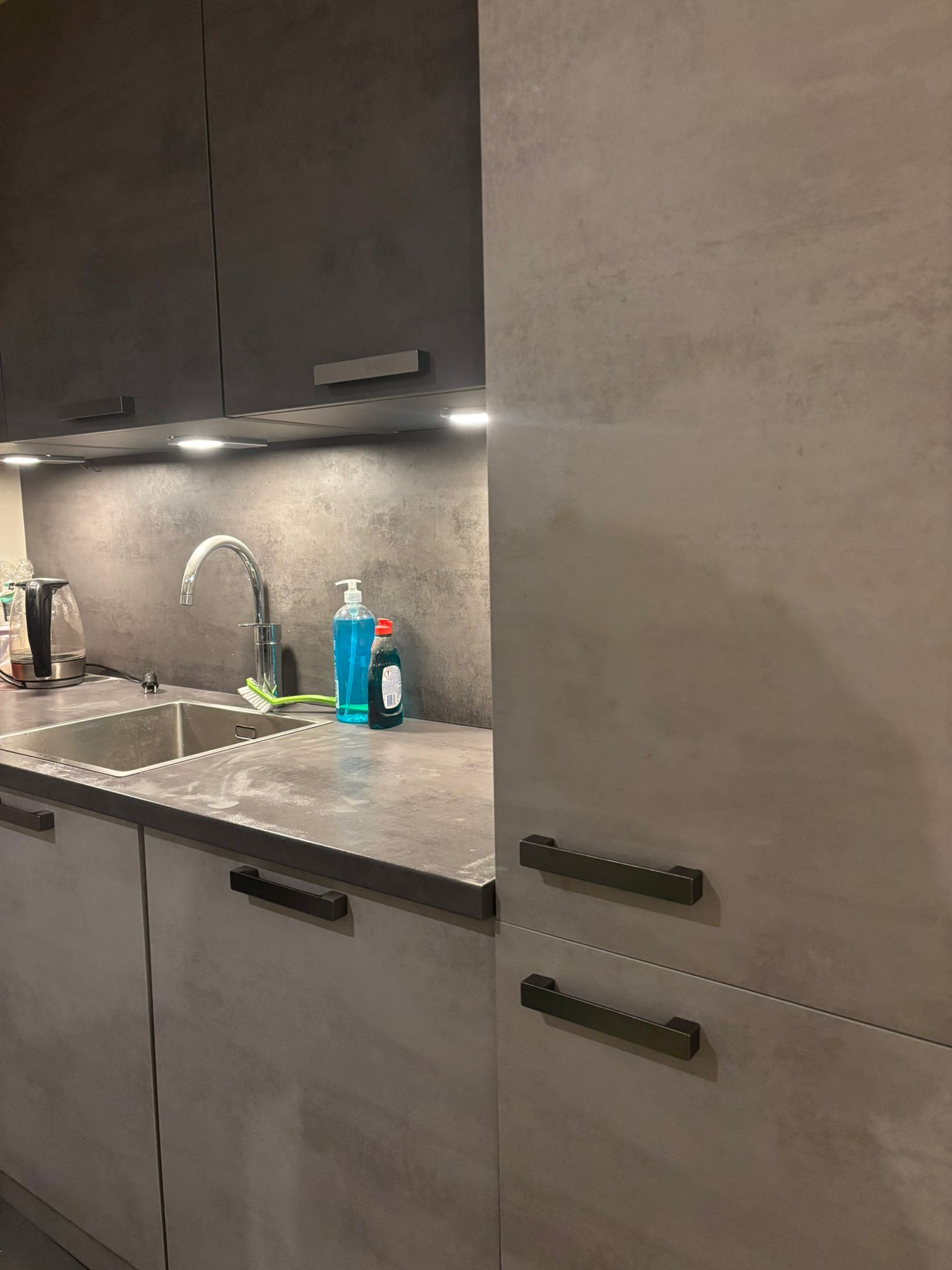 Moderne betongrijze hoekkeuken met apparatuur