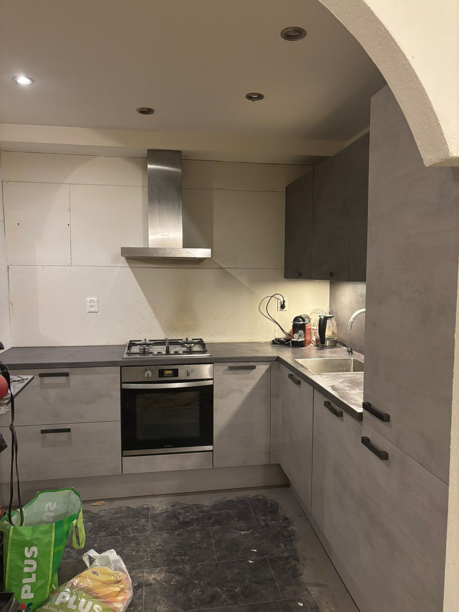 Ben je op zoek naar een stijlvolle, moderne keuken voor een aantrekkelijke prijs? Deze betongrijze hoekkeuken met complete set Indesit inbouwapparatuur is precies wat je zoekt!