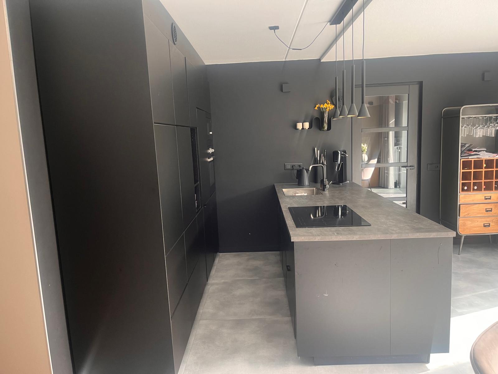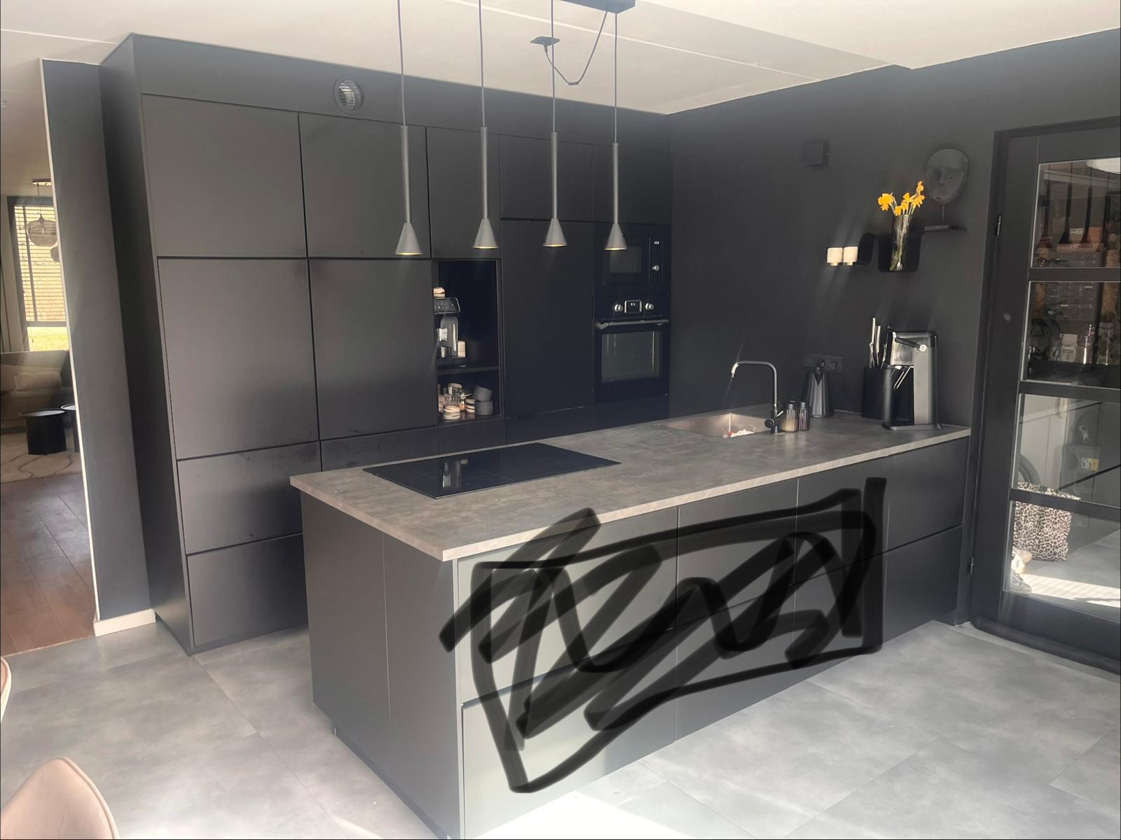 Te koop: moderne matzwarte eilandkeuken in greeploze uitvoering. De keuken heeft een strakke en moderne uitstraling en is voorzien van een kunststof werkblad. Dankzij het kookeiland is er veel werk- en opbergruimte en kan het eiland ook perfect gebruikt worden als bar of zitgedeelte.