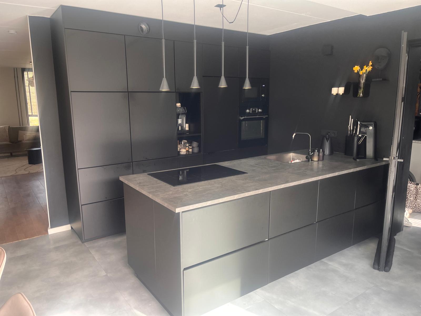 Moderne matzwarte eilandkeuken + apparatuur