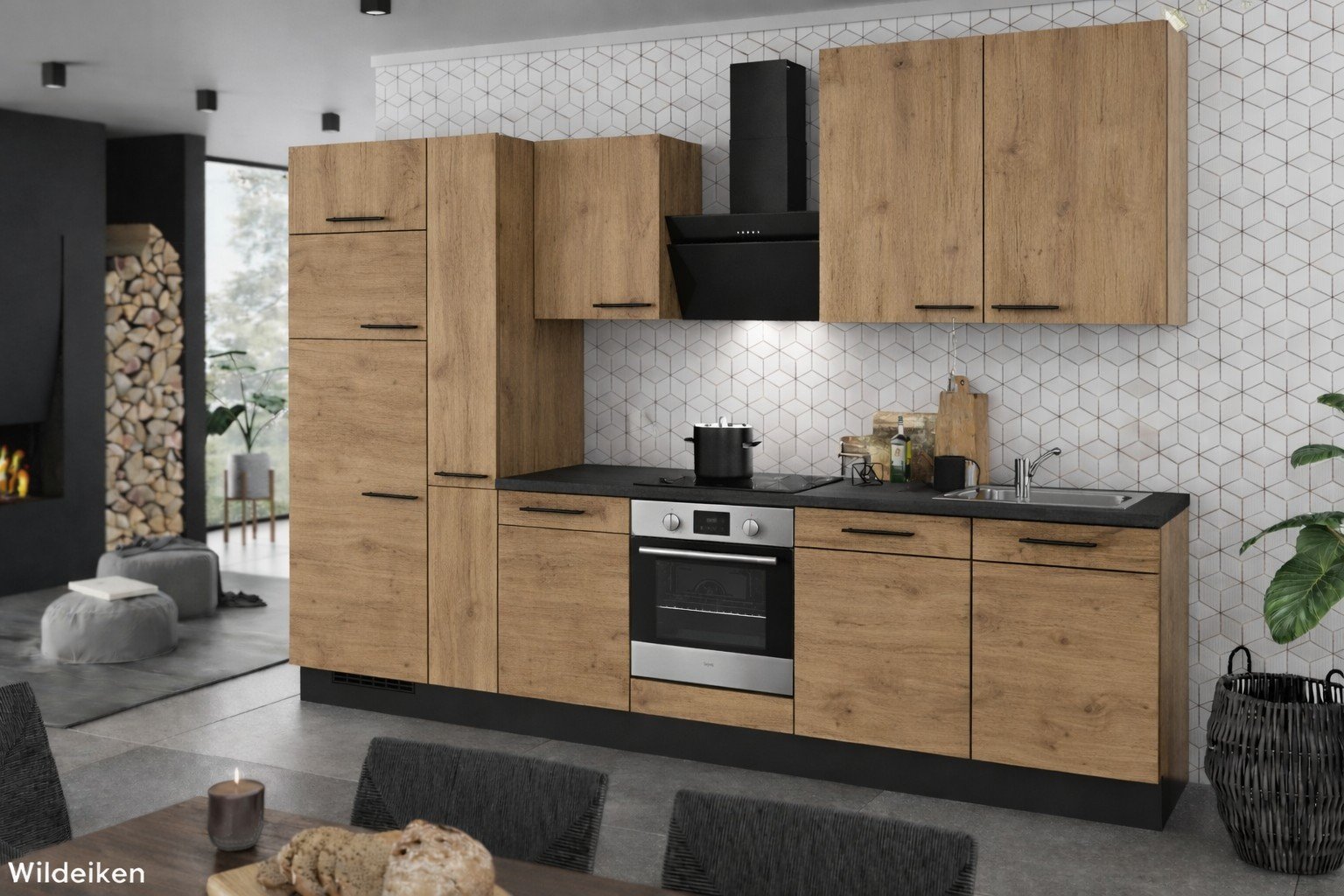Stijlvolle rechte keuken in wildeiken kleur met luxe uitstraling en hoogwaardige afwerking.