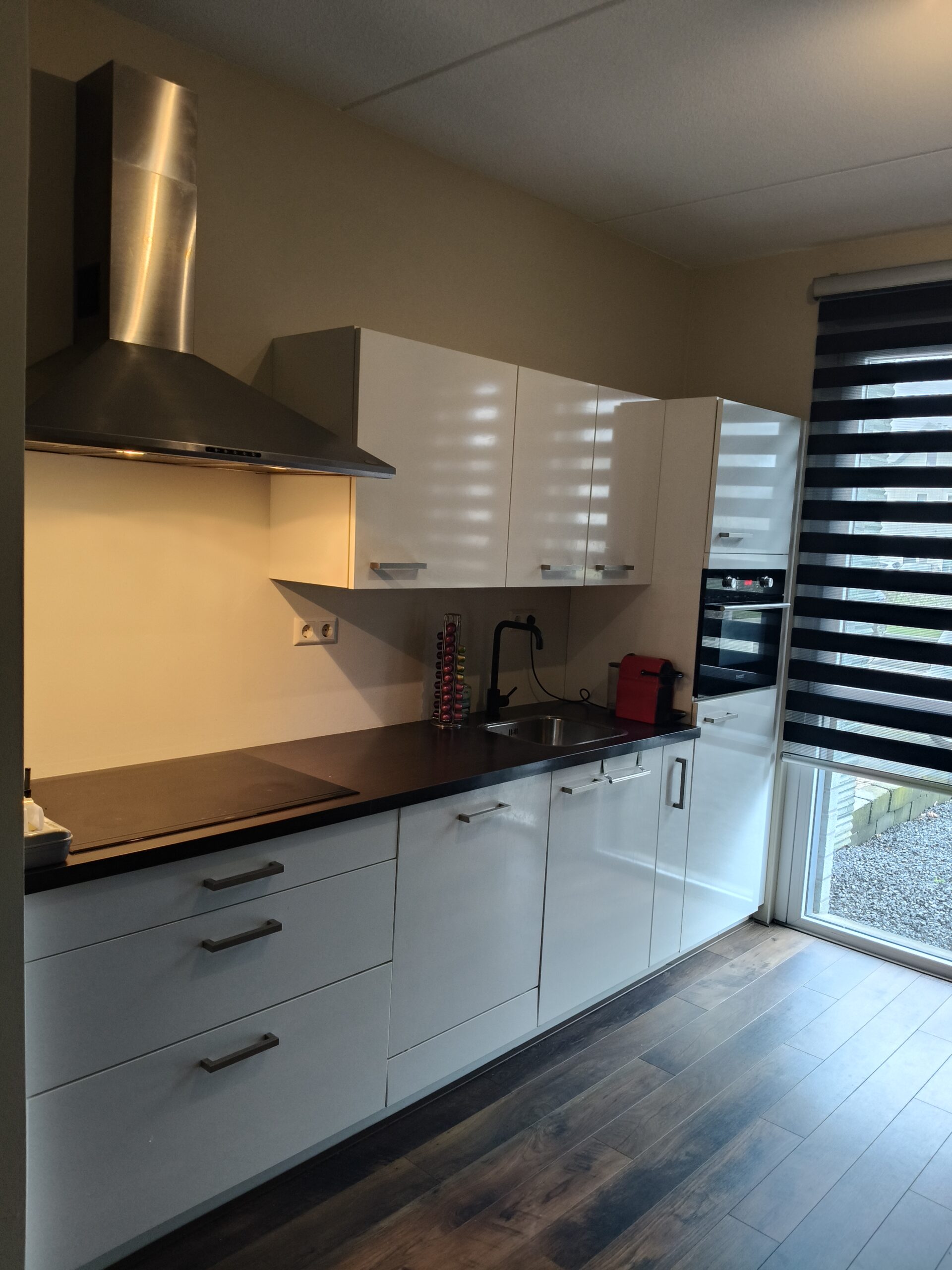 De keuken heeft een strakke, moderne uitstraling en biedt veel opbergruimte. Dankzij het kunststof werkblad en de RVS spoelbak is de keuken praktisch en makkelijk te onderhouden.